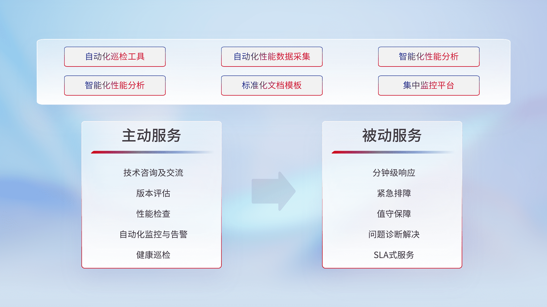 智能化工具和标准化文档,,,,保障服务质量,,提供主动服务(包含技术咨询、、版本评估、、、、性能检查、、自动化监控与告警、、健康巡检)和被动服务包含(分钟级响应、、、紧急排障、、、、值守保障、、、、问题诊断解决、、、、SLA服务)。。。。