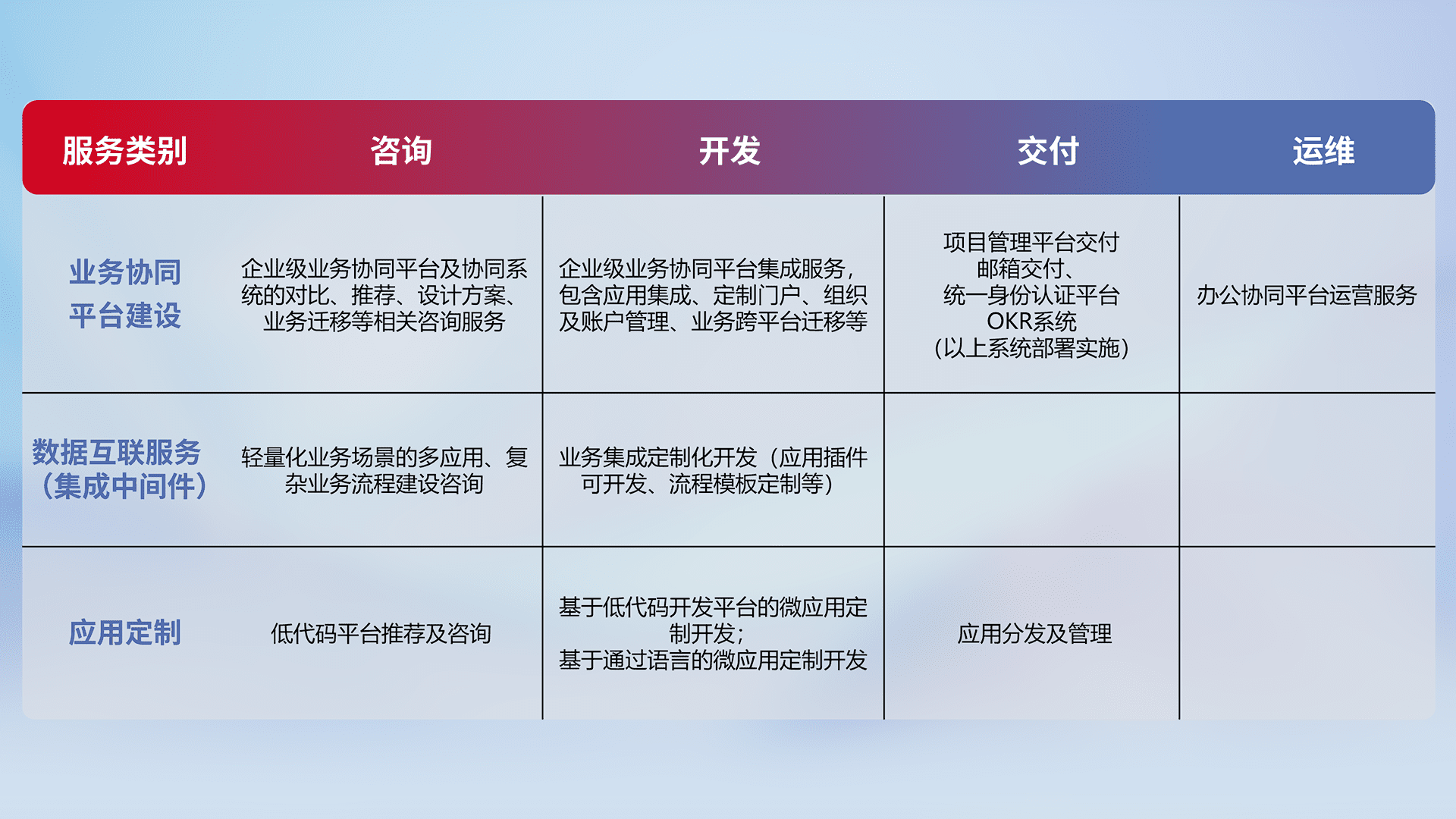 针对钉钉、、企微、、、、IDaas等平台级产品提供产品的规划、、方案、、交付、、定制化开发等服务,,,,实现如统一协同办公、、智能客户服务、、混合会议管理、、、、智能数据查询、、、等业务场景,,实现数字化转型。。